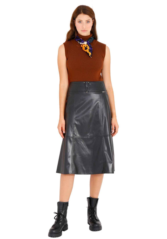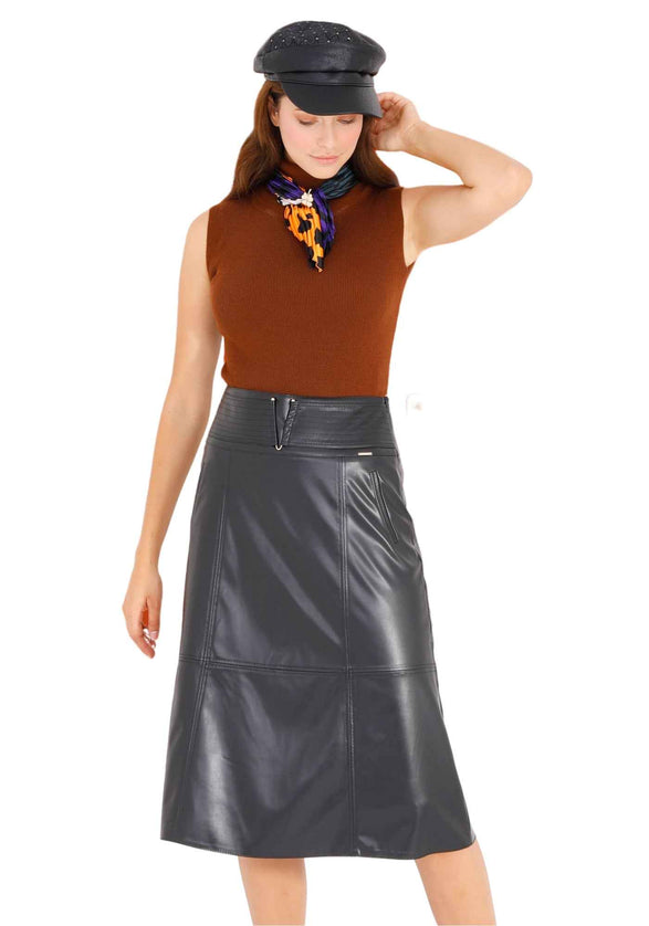 Black A-Line Vegan Leather Flared Midi Skirt - G-Line