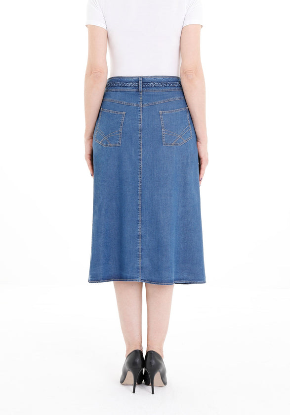 Blue Tencel A-Line Denim Midi Skirt with Knit Waistband Belt and Pockets - G-Line