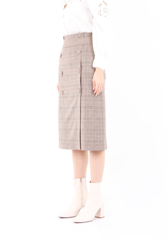 Camel Midi Tartan Straight Plaid Belted Skirt with Decorative Buttons