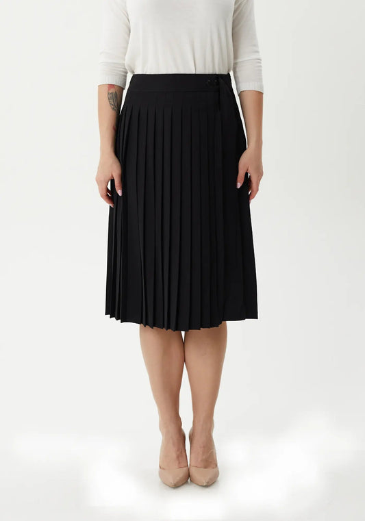 Pleated Button-Front Black Midi Skirt