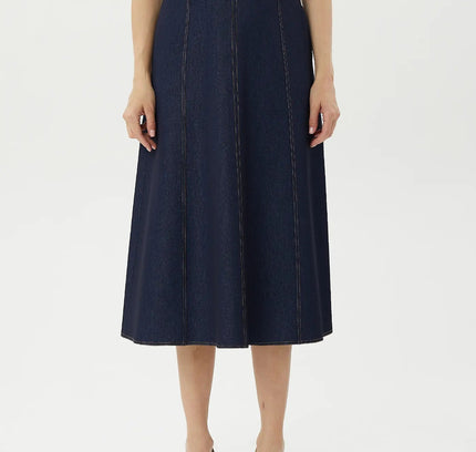 Denim Midi Skirt with Boho A-Line Design, Below the Knee