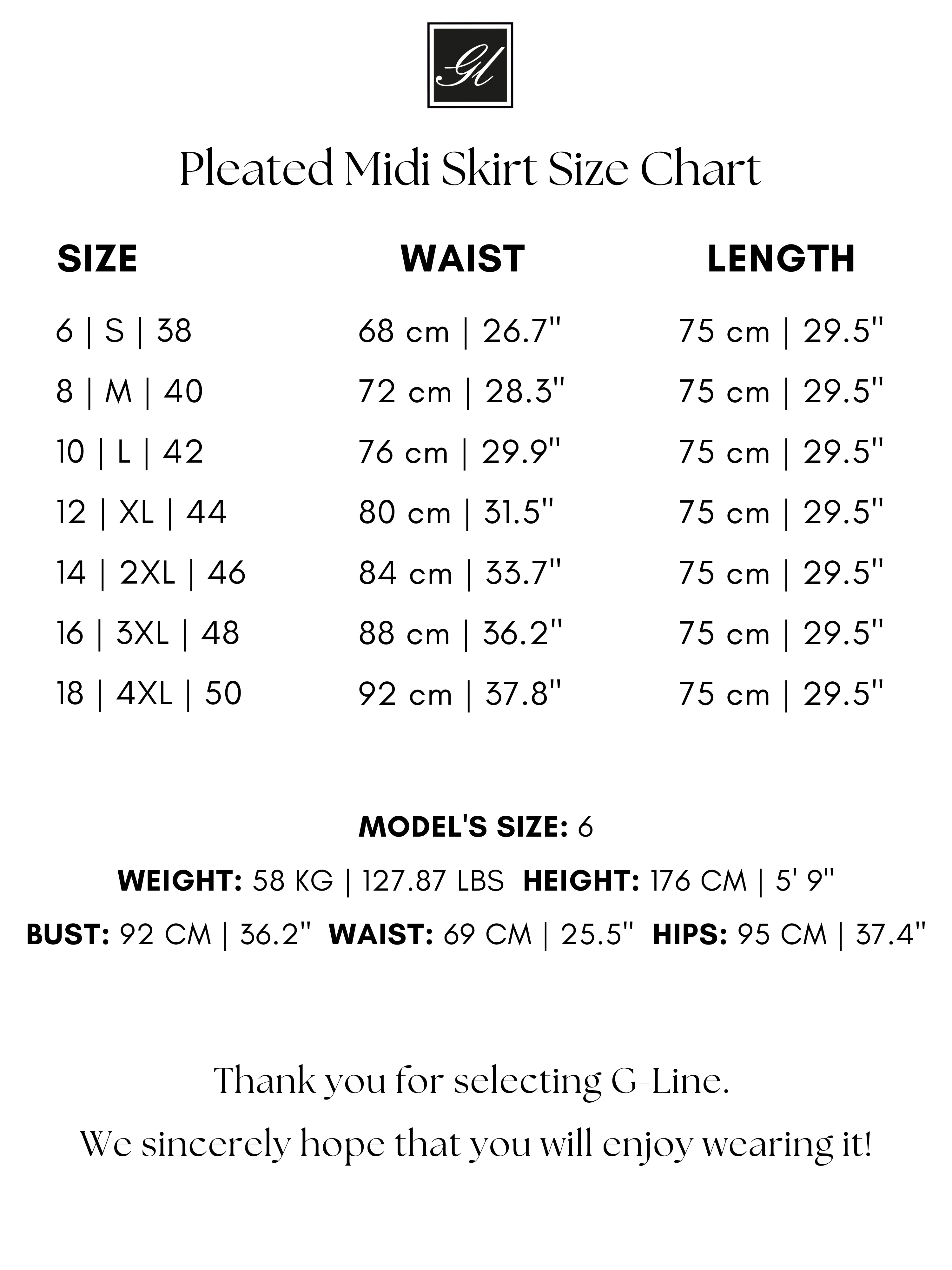 Discover the G-Line Pleated Midi Skirt with an elastic waist, a perfect blend of style and comfort. Its chic pleats add a touch of elegance to any outfit. This plise skirt's versatile design makes it suitable for various occasions. Experience a comfortable and flattering fit that complements your body. Available in a variety of sizes and colors, making it an essential addition to your wardrobe.