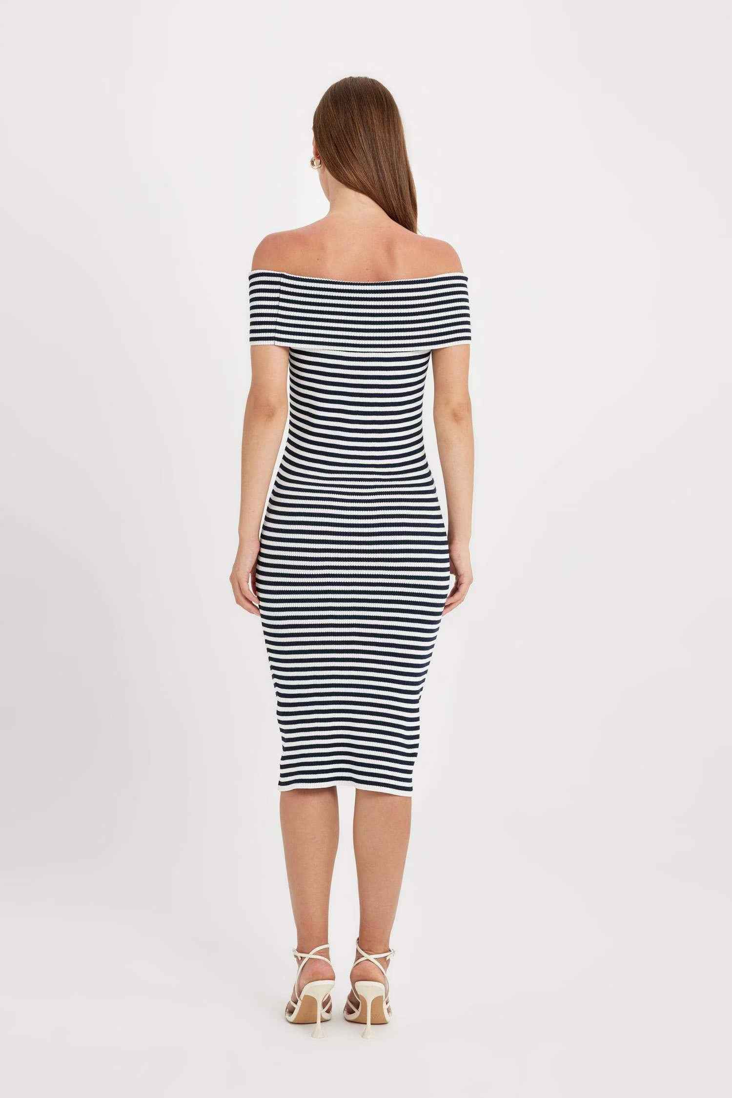 Fitted Striped Open Shoulder Ribbed Midi Dress