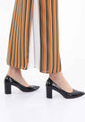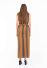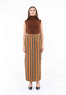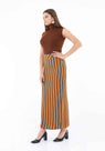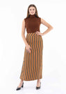 This full-length patterned skirt features a stylish stripe design and is made of lightweight fabric. The high-waisted elastic closure ensures a comfortable fit, while the side slit with thin pleats adds a touch of elegance.